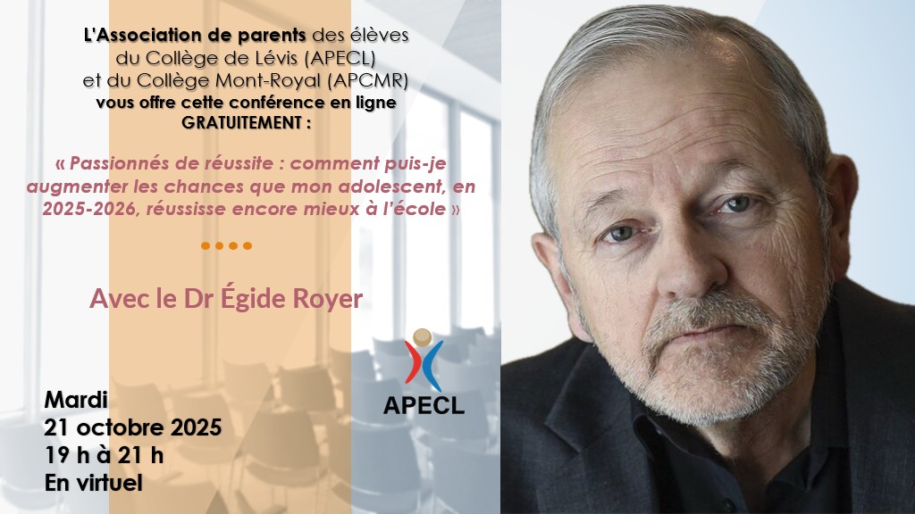Votre Association de parents des élèves du Collège de Lévis « APECL » est heureuse de vous offrir un webinaire avec un conférencier de grande renommée, le Dr Égide Royer.